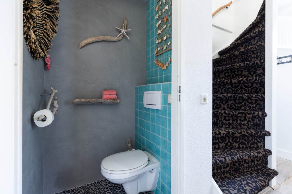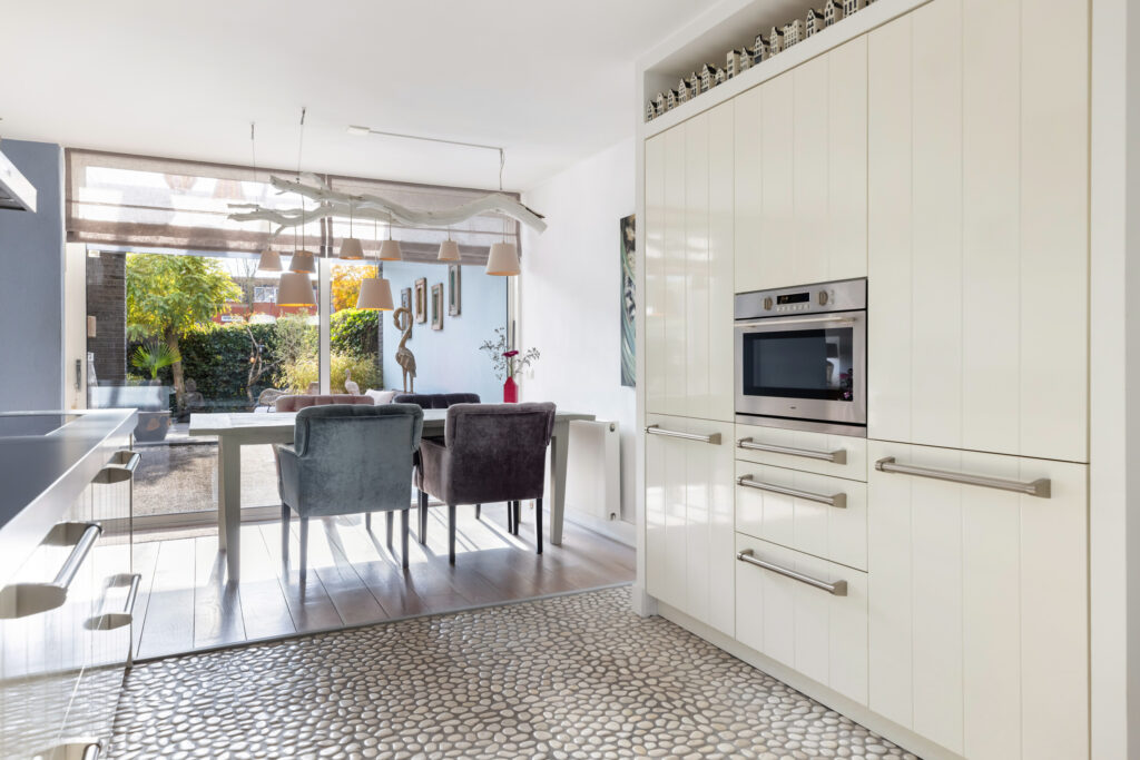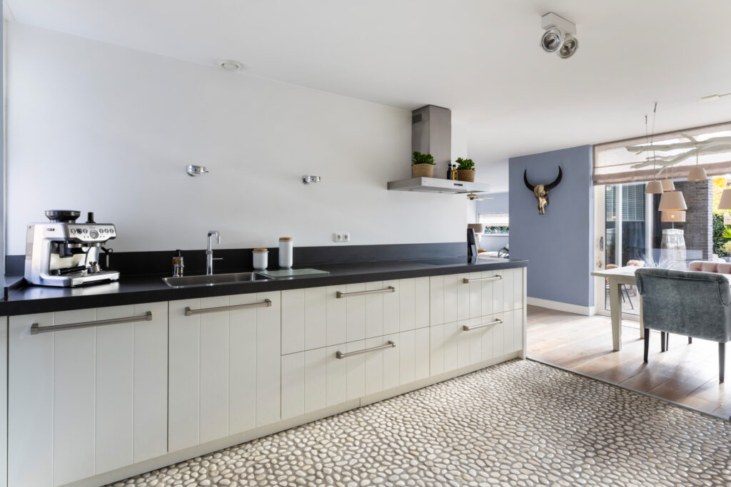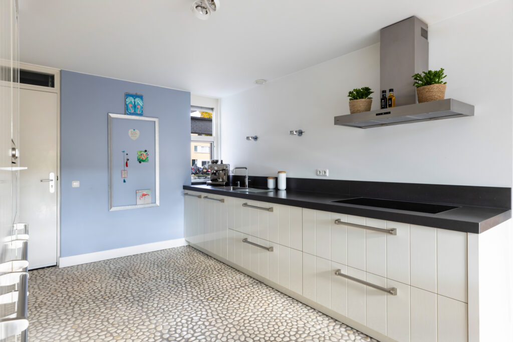 Vanuit de woonkamer bereik je de royale en lichte woonkeuken (ca. 12m²). Deze keuken straalt een moderne strandsfeer uit door de combinatie van lichte kleuren, natuurlijke materialen en de unieke mozaïek pebblestone-vloer. De keuken is uitgerust met een extra diep natuurstenen werkblad van 75 cm, een grote RVS-spoelbak, een praktische Quooker-kraan en diverse inbouwapparatuur, waaronder een 4-pits keramische kookplaat (Atag), RVS-afzuigkap (Atag), combi-oven (Atag), grote koelkast met climat freshboxen (Atag) en vaatwasser (AEG). Dankzij de grote raampartij en de vele lades biedt deze keuken niet alleen volop licht en ruimte, maar ook veel bergruimte. Een heerlijke plek voor kookliefhebbers en gezellige etentjes met familie of vrienden.