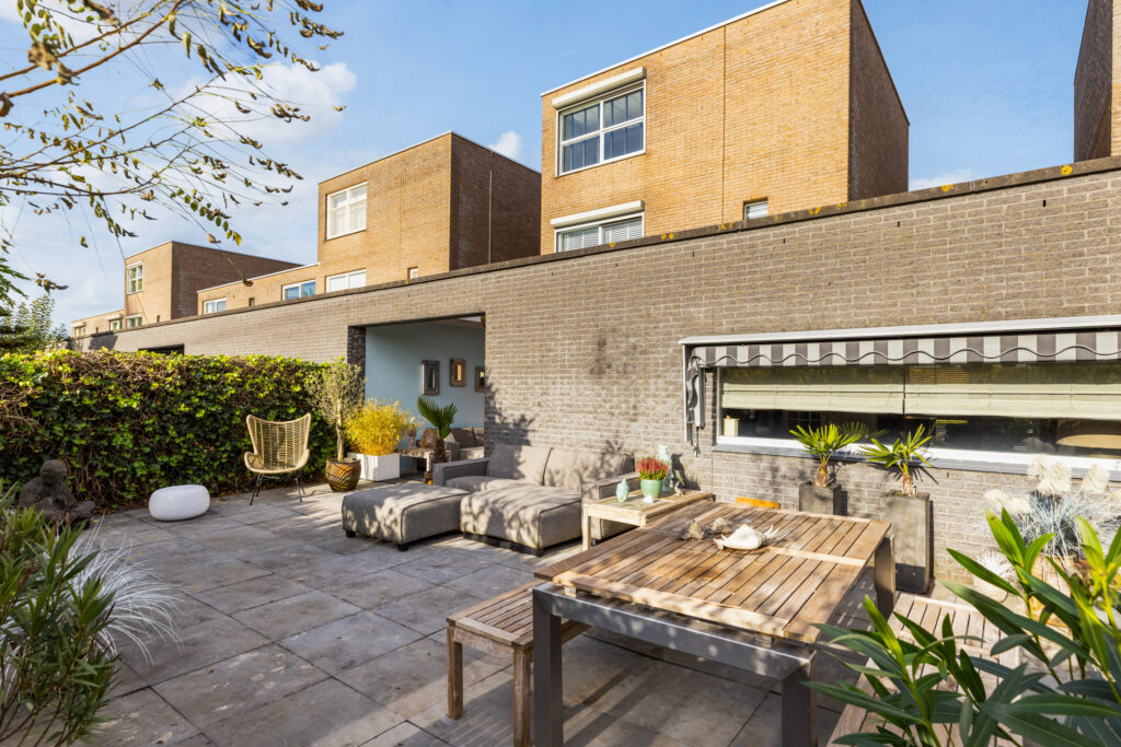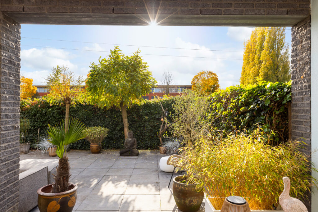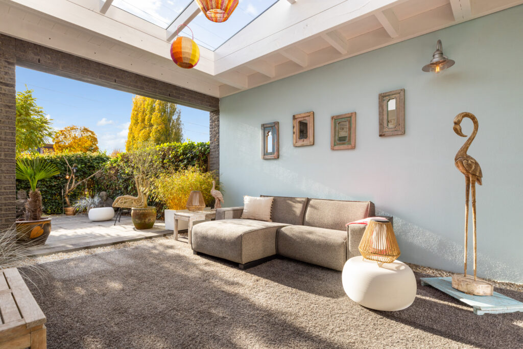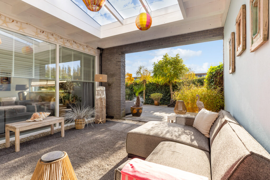 Via de schuifpui in de keuken stap je zo de sfeervolle, overdekte patio in en vervolgens door naar de fraai aangelegde achtertuin op het zuiden. De huidige bewoners hebben recent een prachtige overkapping met lichtkoepels gerealiseerd, waardoor je al vroeg in het voorjaar én tot laat in het najaar kunt genieten van het buitenleven.