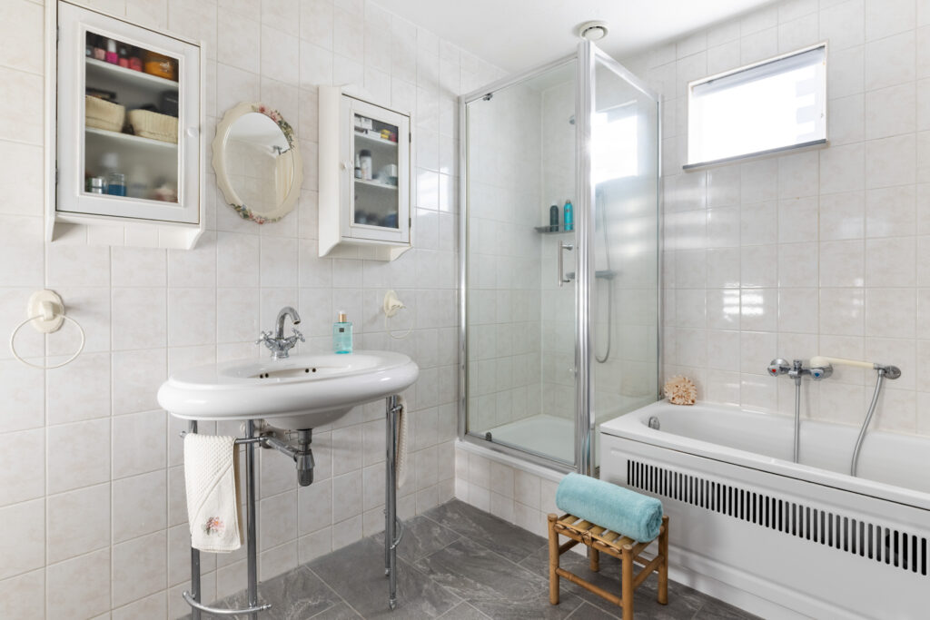 De ruime badkamer is voorzien van een douchecabine, wastafel met spiegel, groot ligbad met verwarmingfunctie, toilet en een raam.