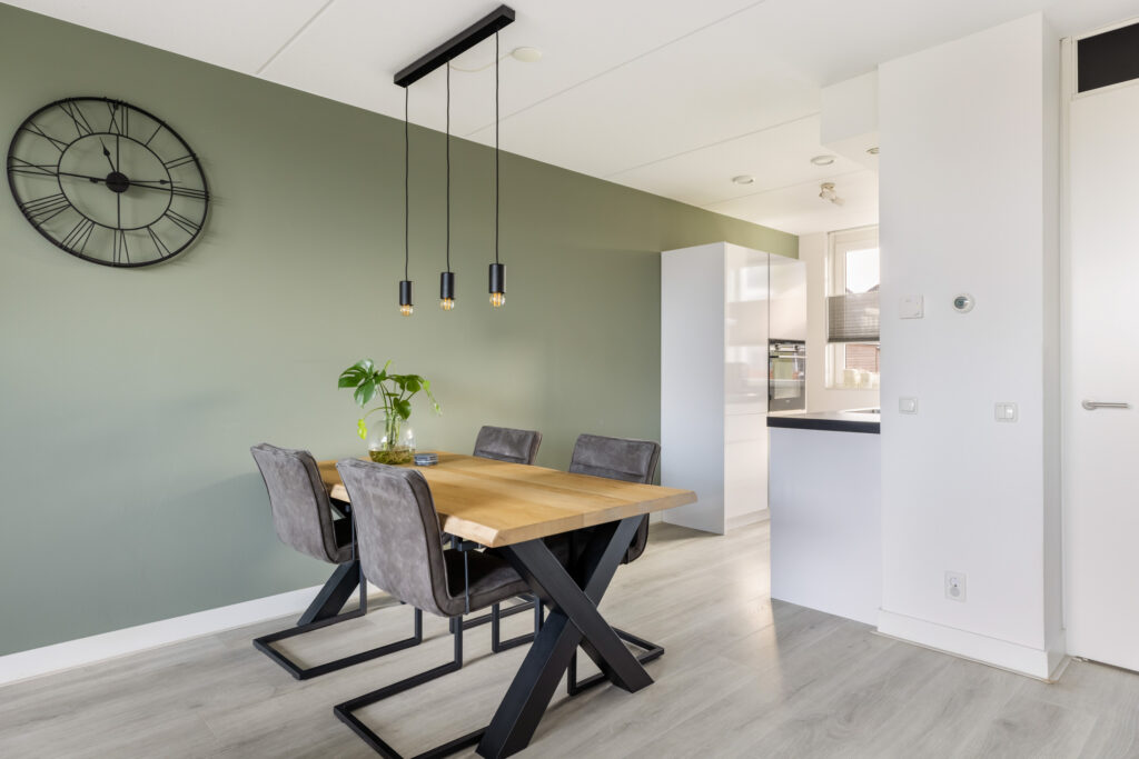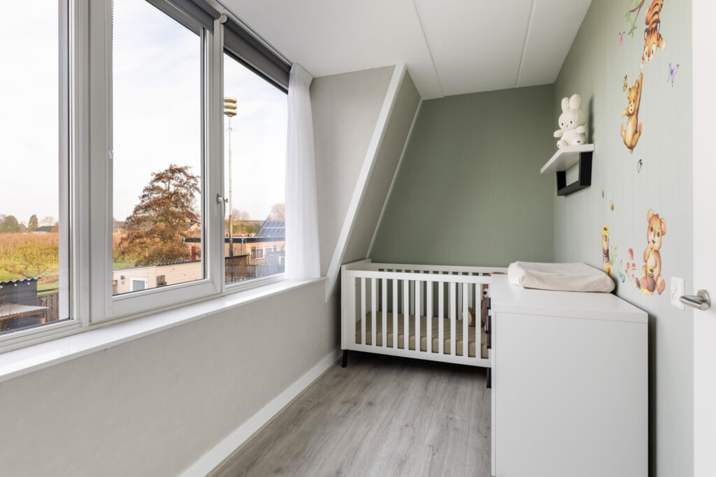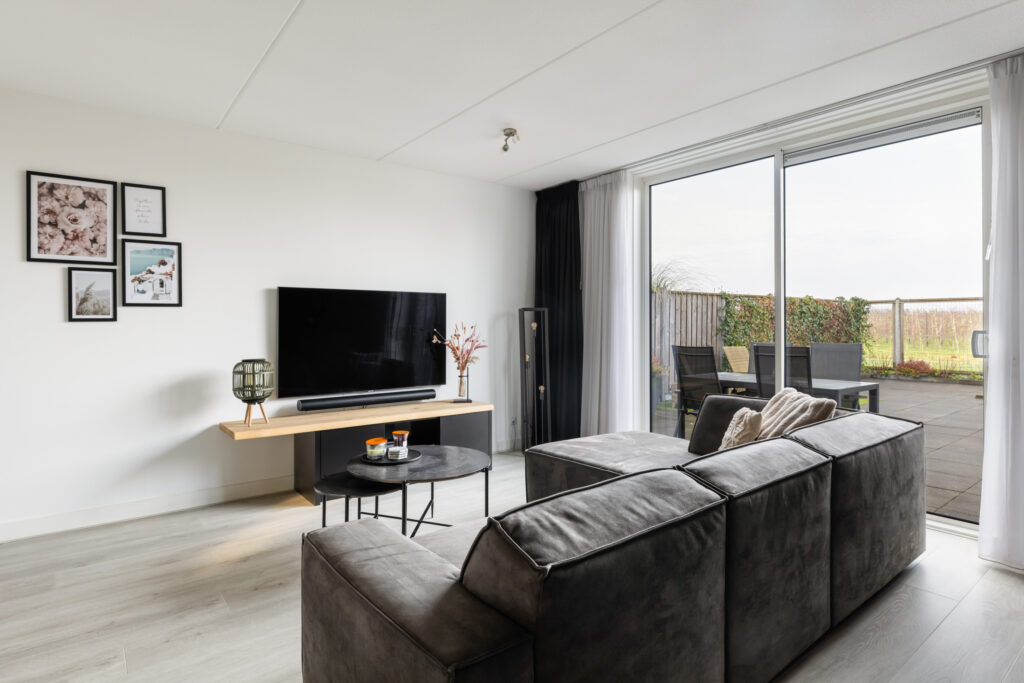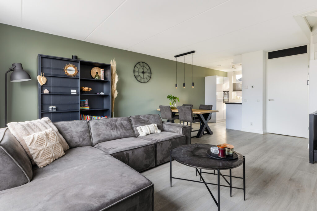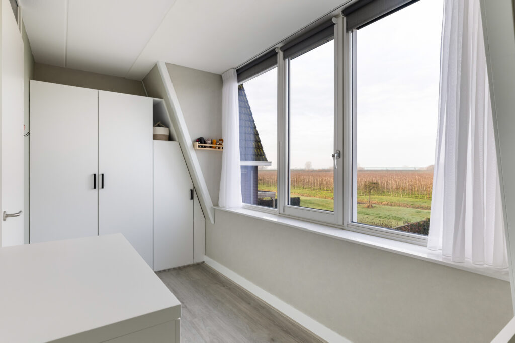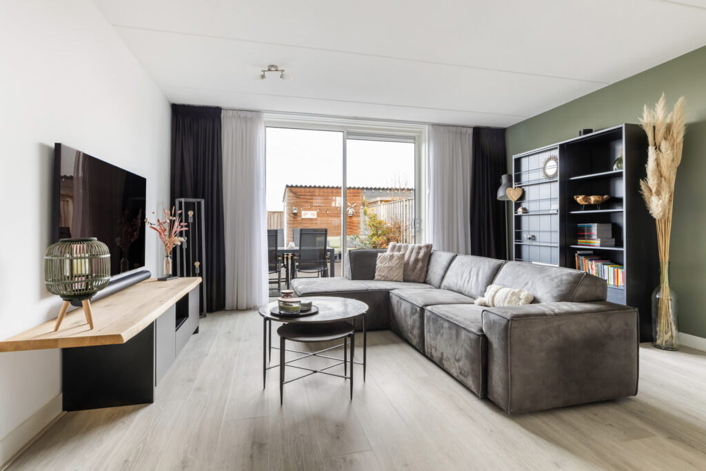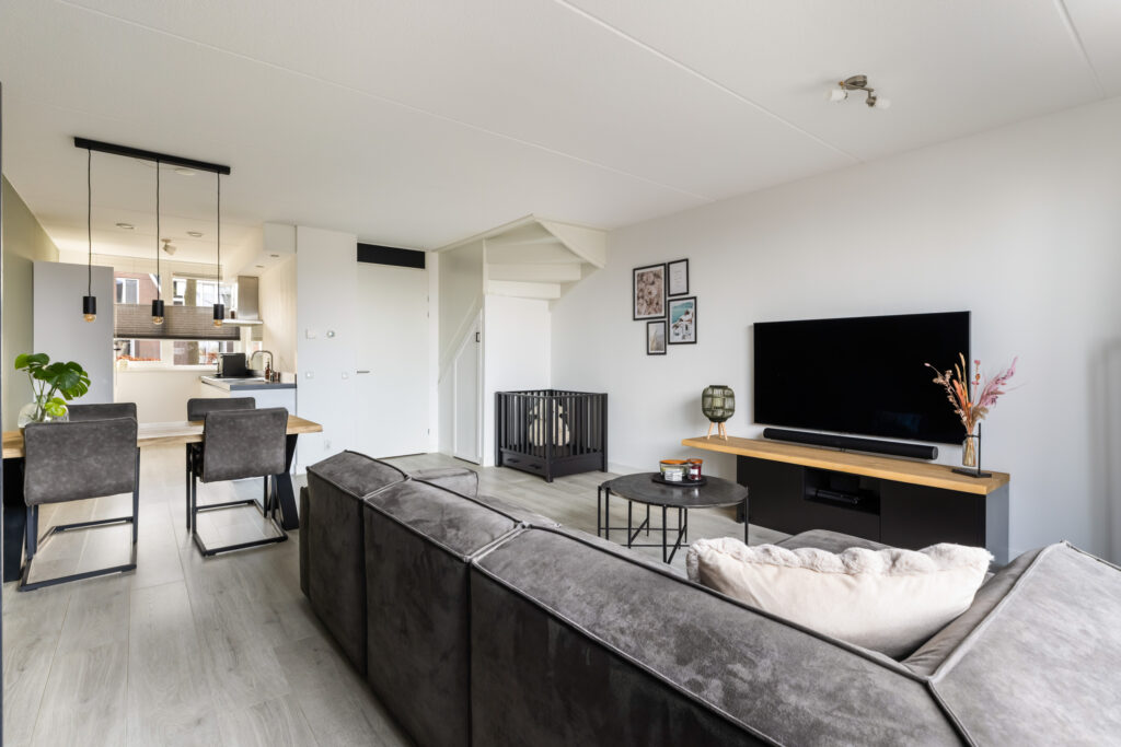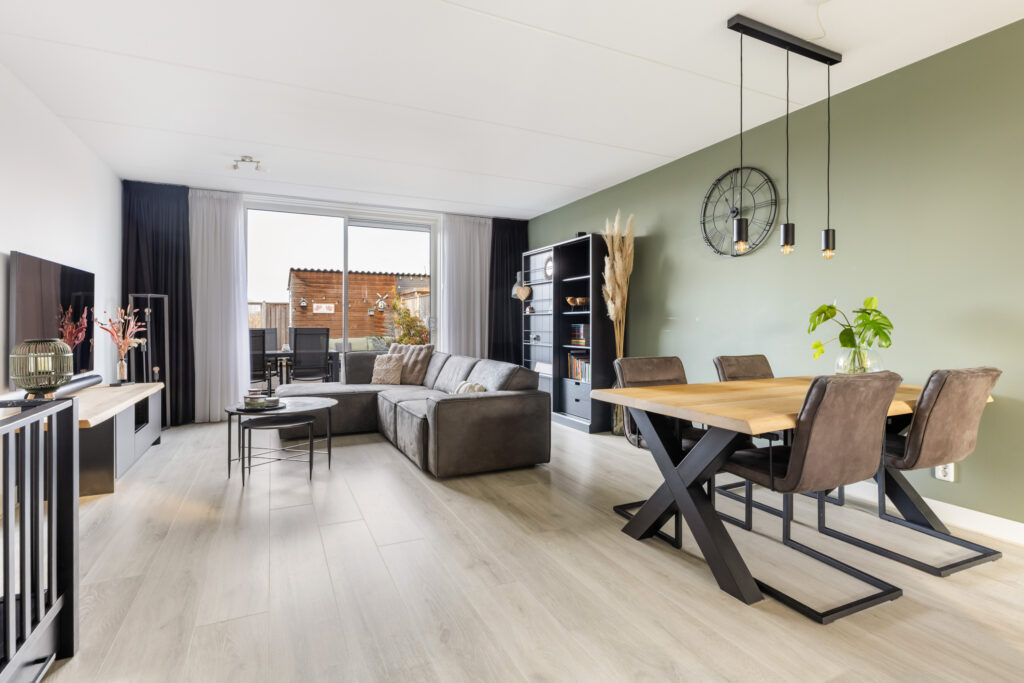 De lichte woonkamer (ca. 31m²) beschikt over een schuifpui naar de zonnige tuin en biedt een fraai uitzicht op de achterliggende boomgaard. Dankzij de grote raampartij geniet je hier van veel natuurlijk licht en een prettige verbinding met buiten. Daarnaast is de woonkamer voorzien van een praktische trapkast. De lichte laminaatvloer in combinatie met comfortabele vloerverwarming zorgt voor extra wooncomfort.