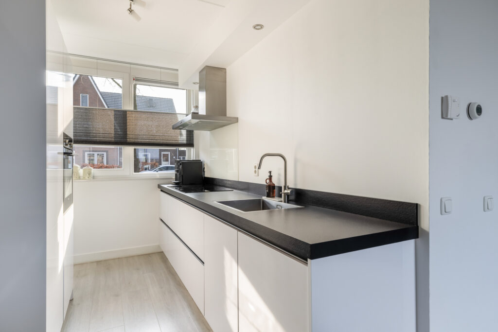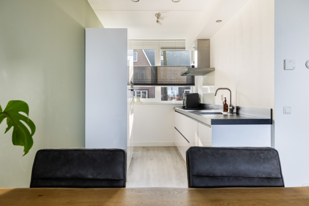 Vanuit de hal met meterkast, vaste gangkast, trapopgang naar boven, garderobe en modern toilet met fontijn, bereik je de lichte woonkamer met aan de voorzijde een open keuken met grote raampartij.