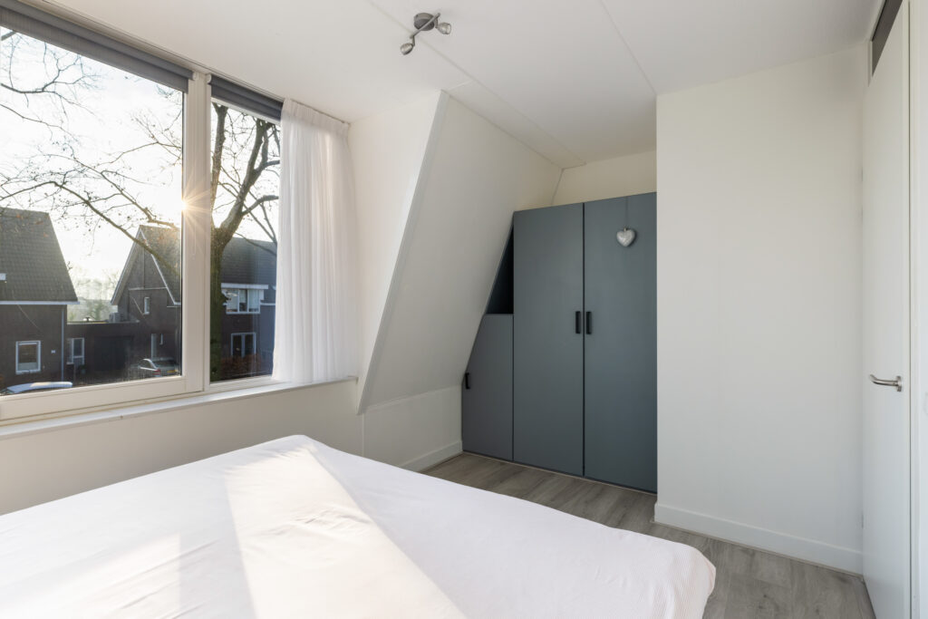 Via de trap in de hal bereik je de overloop op de eerste verdieping, met toegang tot twee slaapkamers en wasmachine/-drogerkast. Aan de voorzijde bevindt zich een slaapkamer (ca. 12 m²) met een vaste kastenwand. De tweede slaapkamer (ca. 9m²) is aan de achterzijde van de woning gelegen en eveneens voorzien van een vaste kastenwand. Beide slaapkamers beschikken over een grote raampartij in de dakkapel, wat zorgt voor veel licht en een ruimtelijk gevoel.