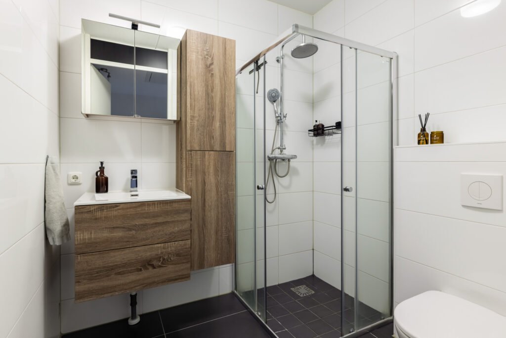 De moderne badkamer is uitgerust met een ruime inloopdouche met hand- en regendouche en glazen douchescherm, wastafelmeubel met spiegelkast en verlichting, kast, designradiator en een toilet.