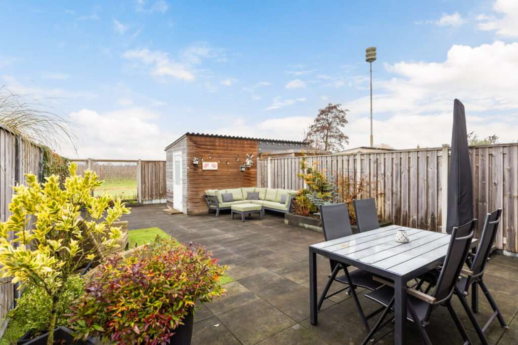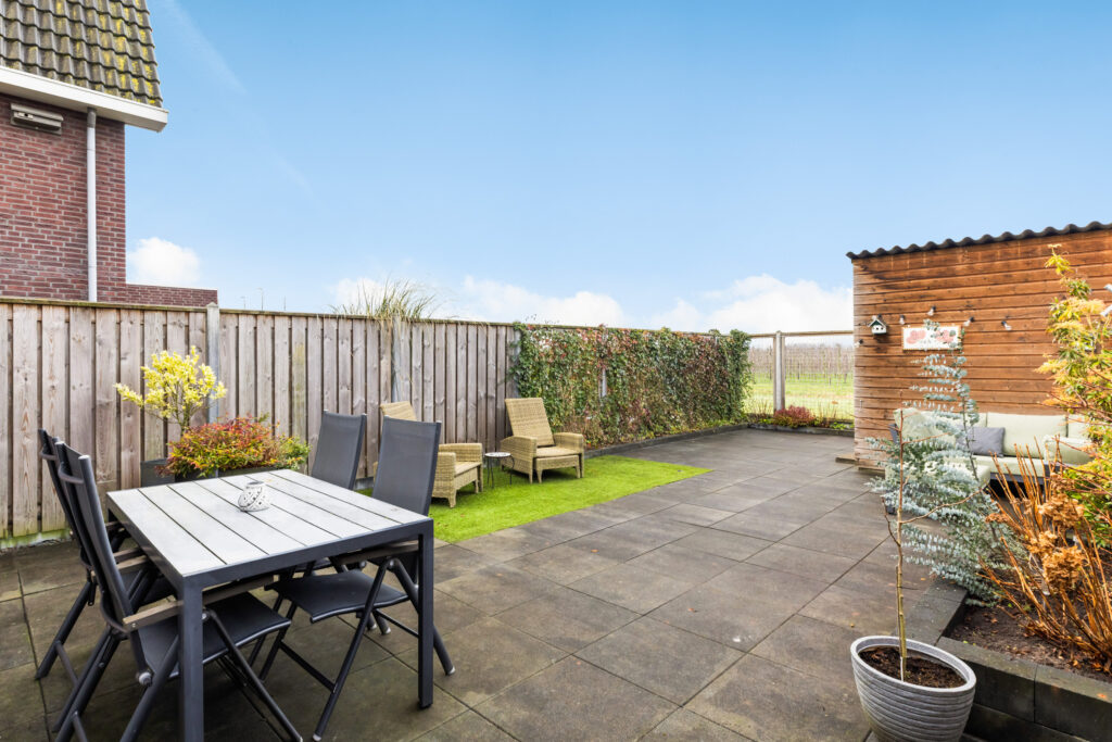 De brede en zonnige achtertuin is gelegen op het westen en biedt de hele dag door een fijne afwisseling van zon en schaduw. Dankzij de vrije ligging en het uitzicht op de groene boomgaard geniet je hier van veel privacy en rust. De tuin is verzorgd aangelegd met diverse borders vol bloemen en planten, sierbestrating en een combinatie van een houten schutting en een groene hedera-schutting. Daarnaast is de tuin voorzien van buitenverlichting, een buitenkraan en een praktische achterom. Via een poort aan de linkerzijde van de woning is de tuin eveneens toegankelijk. De vrijstaande houten berging is uitgerust met elektra.