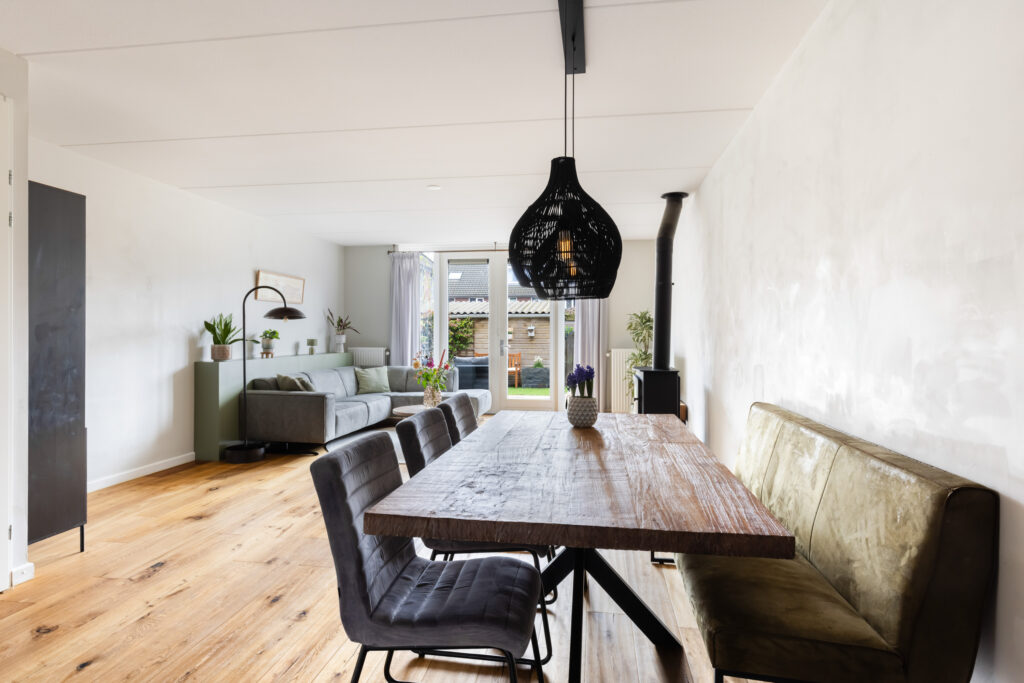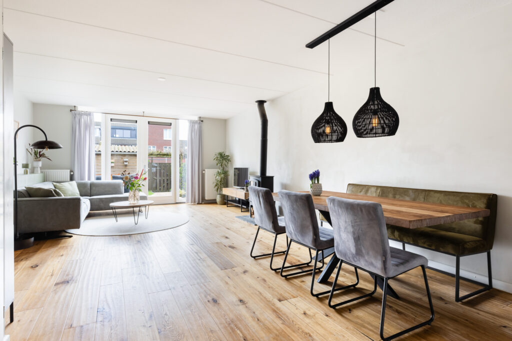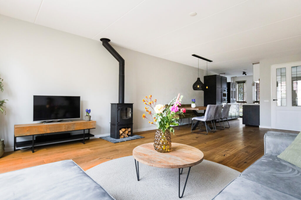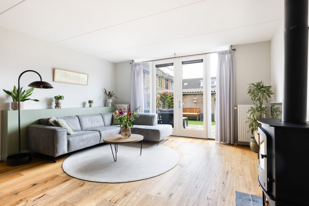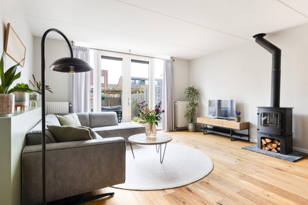 De woonkamer (ca. 35m²) beschikt over een praktische trapkast en een grote raampartij aan de achterzijde, wat zorgt voor veel lichtinval en is uitgerust met een sfeervolle houtgestookte haard. Via de openslaande deuren heb je direct toegang tot de achtertuin. Daarnaast is de achtergevel voorzien van een elektrisch bedienbaar zonnescherm.