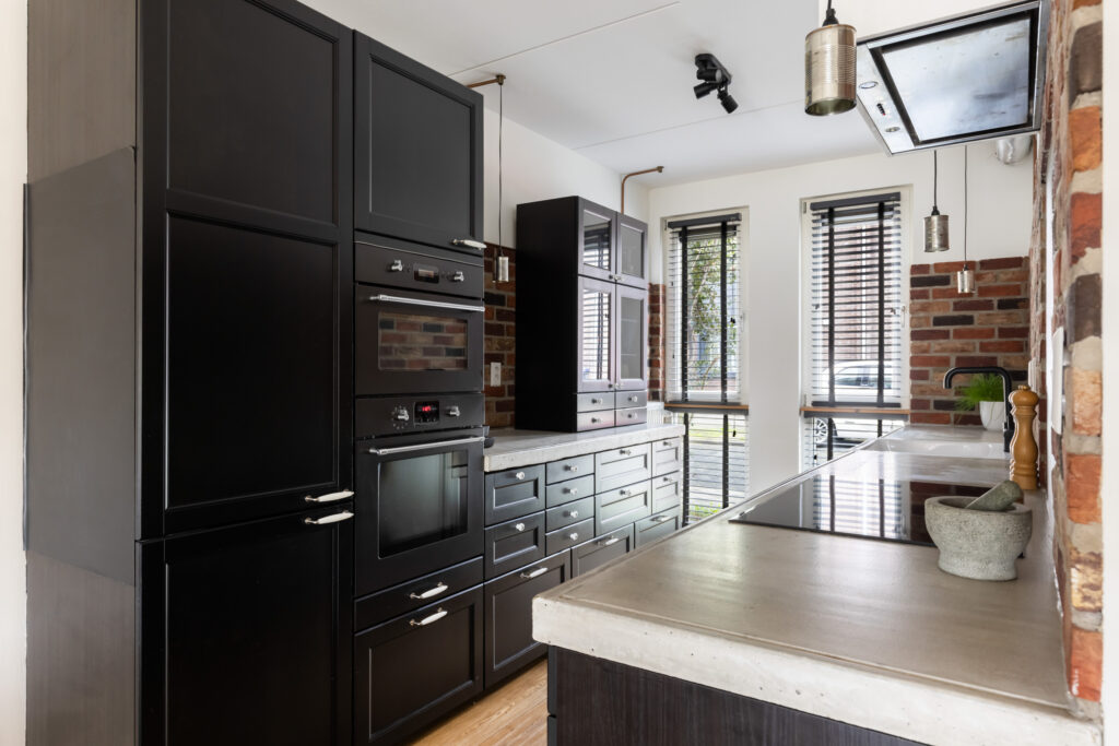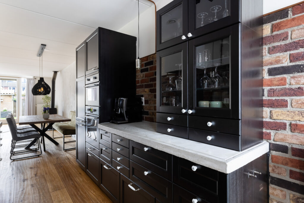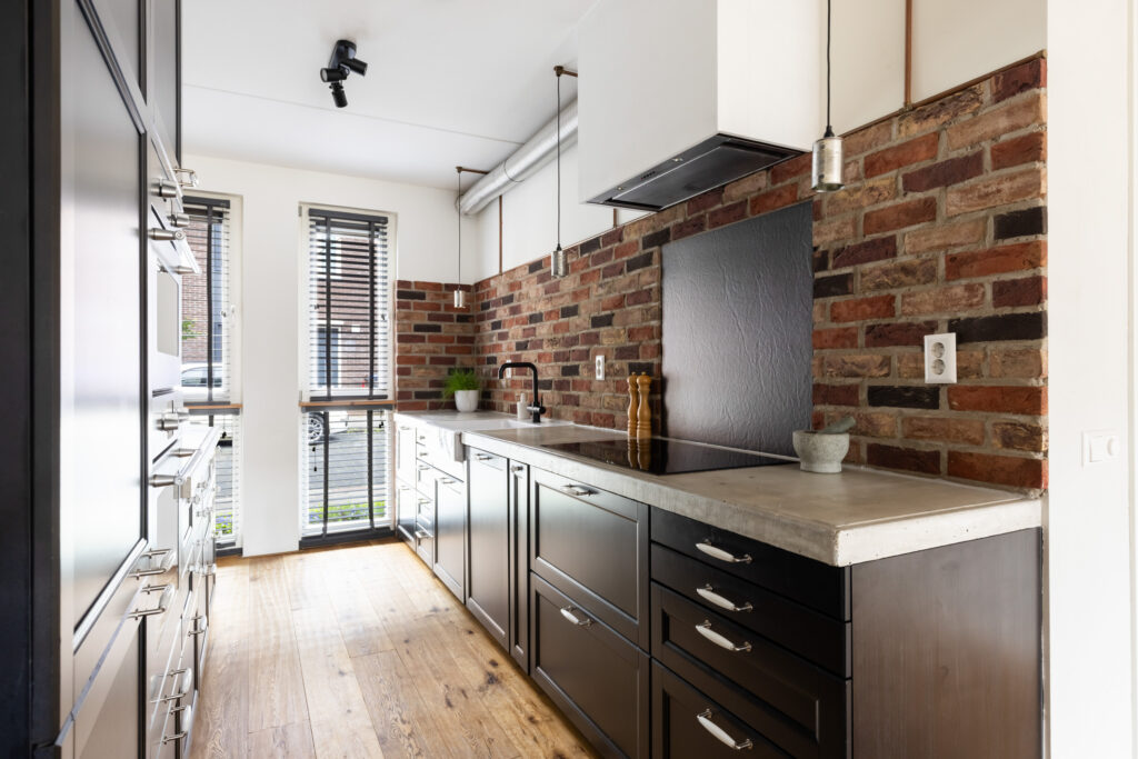 De sfeervolle keuken (ca. 9m²) is uitgevoerd met een betonnen werkblad, een extra grote keramieken spoelbak met praktische kokend waterkraan. De keuken is verder voorzien van diverse inbouwapparatuur, waaronder een 4-pits inductiekookplaat (Aeg 2022), afzuigkap, vaatwasser, heteluchtoven, combimagnetron en een koel-vriescombinatie.
