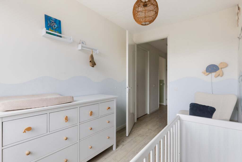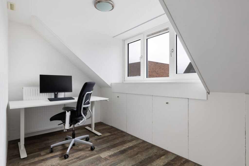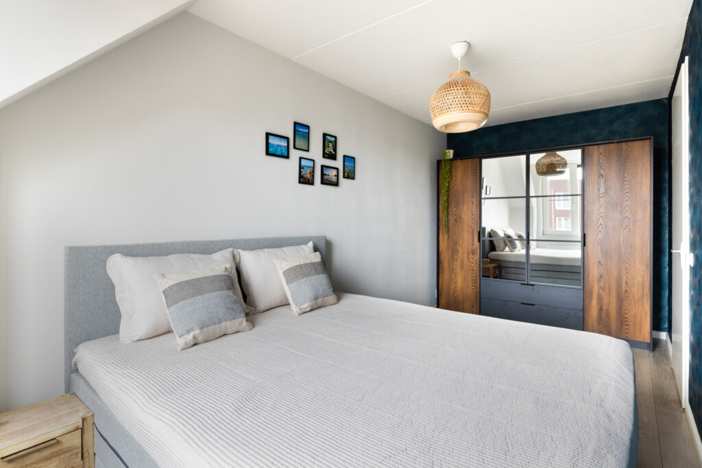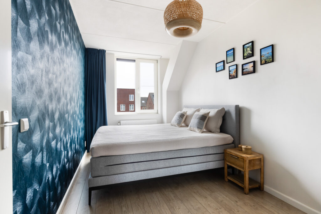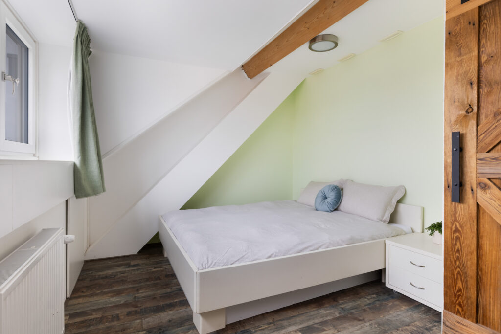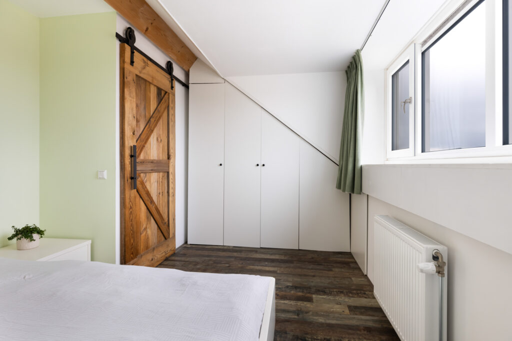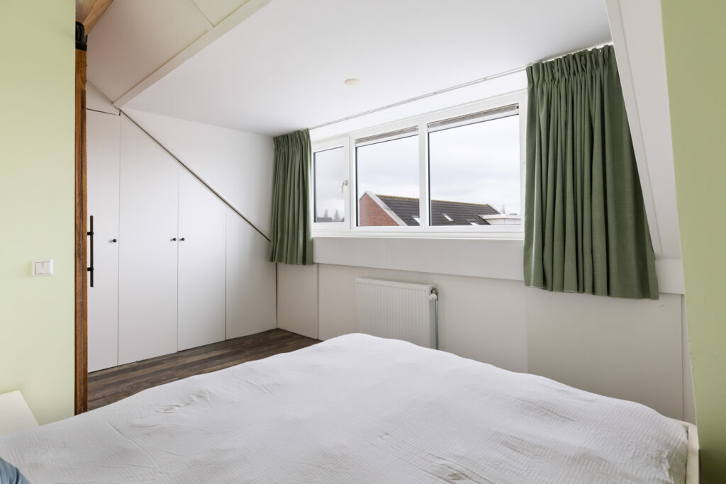 Aan de achterzijde van de woning bevinden zich een tweetal slaapkamers (ca. 8 m² en ca. 13 m²). Vanuit deze kamers is er prettig zicht op het groene sedumdak, wat zorgt voor een rustig en groen uitzicht. Aan de voorzijde bevindt zich de derde slaapkamer (ca. 8m²) en de badkamer.