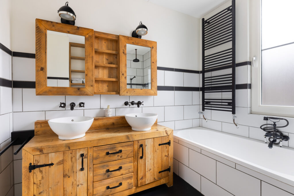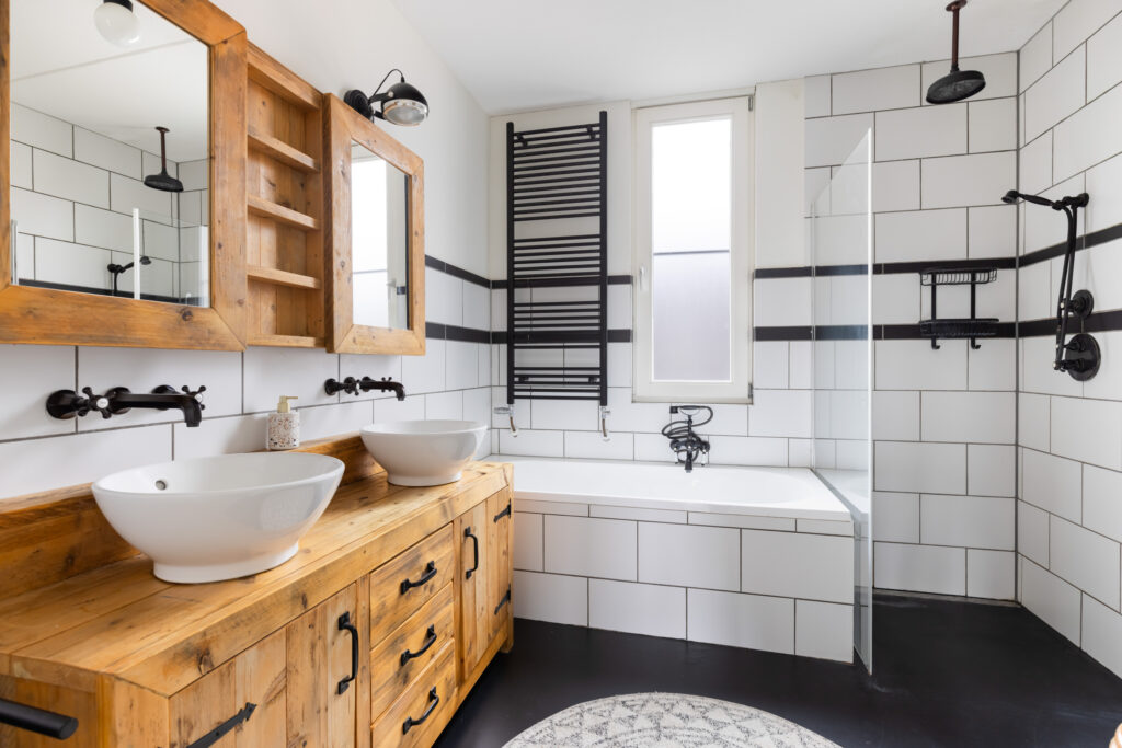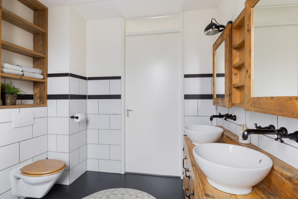 De moderne badkamer is uitgevoerd met een strakke gietvloer en beschikt over een ruime inloopdouche met hand- en regendouche, een comfortabel duo-ligbad en een stijlvol wastafelmeubel met dubbele kranen en waskommen. Daarnaast is de badkamer voorzien van een spiegelkast met verlichting, een designradiator en een vrijhangend toilet. De grote raampartij zorgt voor een prettige, natuurlijke lichtinval.