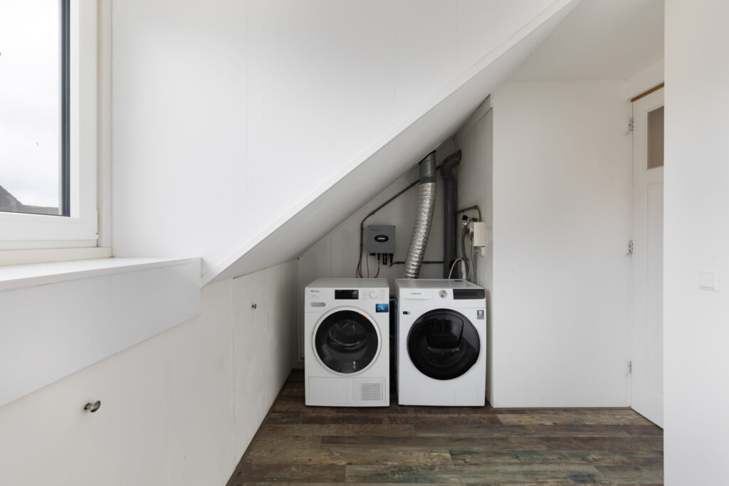 In de slaapkamer aan de voorzijde bevindt zich tevens de opstelplaats voor de wasmachine en droger, de mechanische ventilatie-unit en de verdeler van de zonnepanelen.