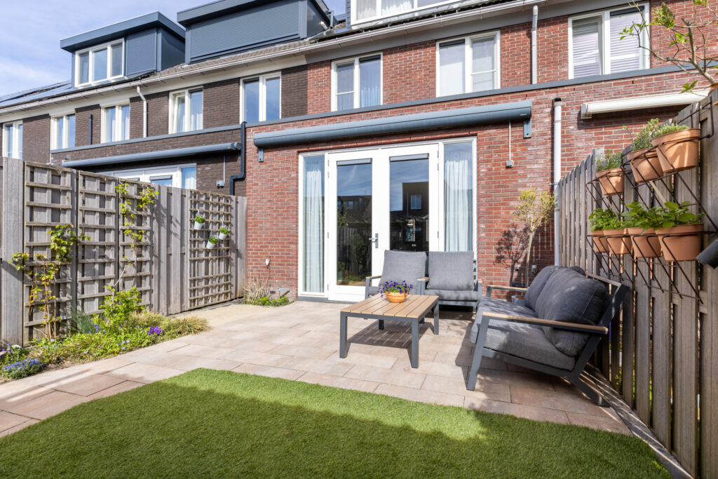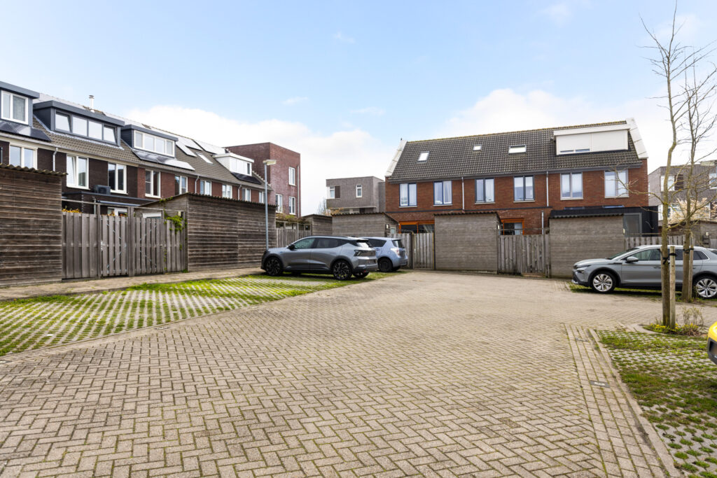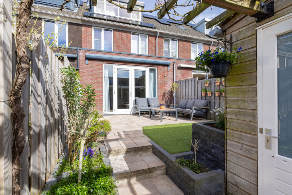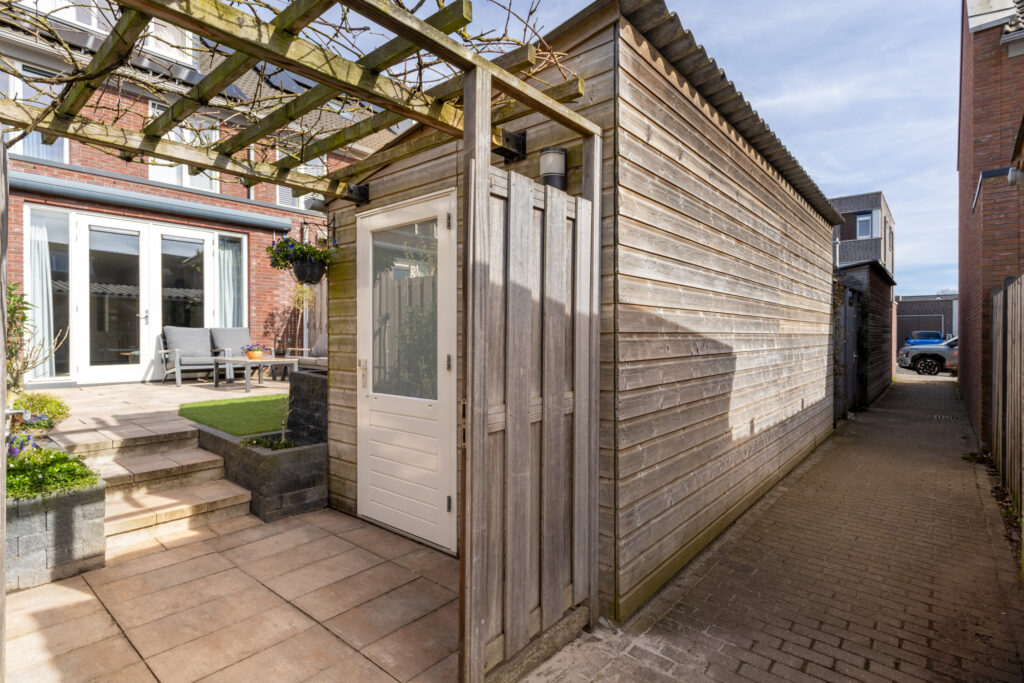 Achter in de tuin staat een vrijstaande houten berging met elektra, ideaal voor het opbergen van fietsen en tuingereedschap. Aan de zijkant van de berging bevindt zich een sfeervolle pergola, begroeid met een mooie druif. Via de achterom bereik je het aangrenzende binnenterrein met een eigen parkeerplaats direct achter de woning.