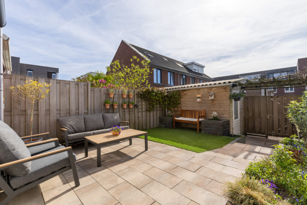 – Sfeervolle achtertuin (2022 aangelegd) op het zuidwesten met vrijstaande houten berging.