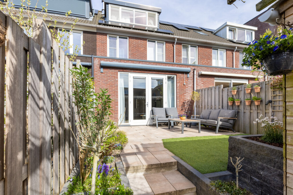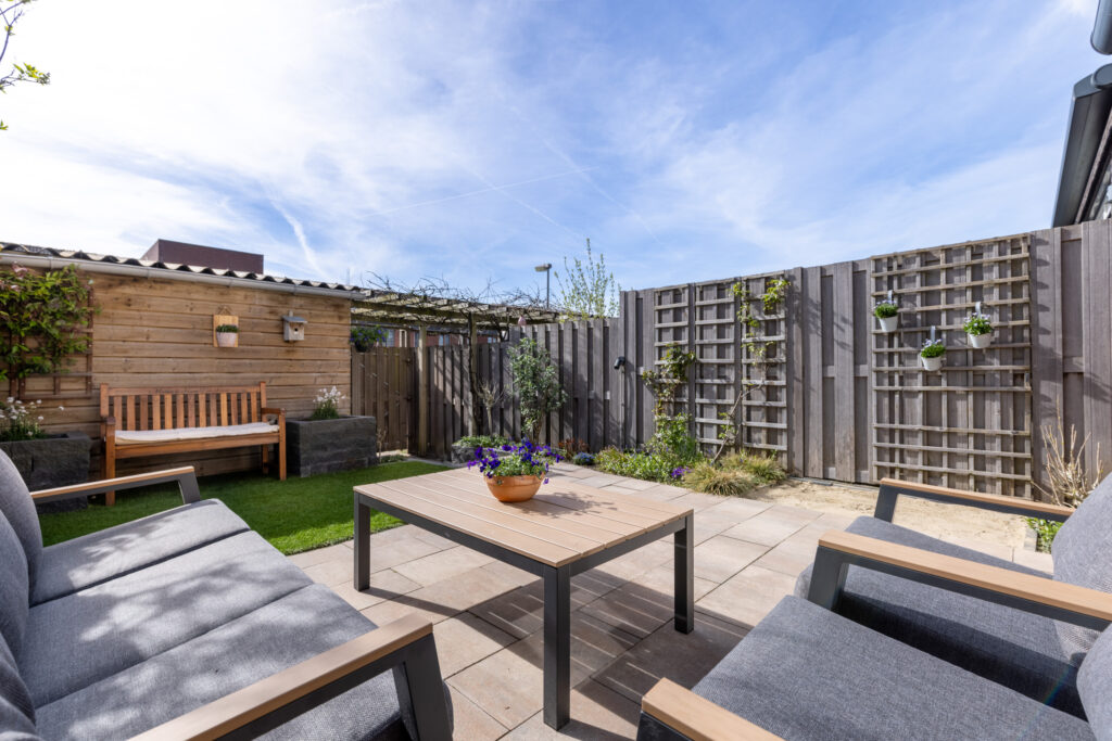 De zonnige achtertuin is gelegen op het zuidwesten en fraai aangelegd met sierbestrating en diverse borders met planten en struiken. De tuin is volledig omsloten door een houten schutting en voorzien van tuinverlichting en een praktische buitenkraan. Hierdoor is het een fijne plek om zowel overdag als in de avonduren van het buitenleven te genieten.